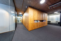 Vollständig ausgebaute Bürofläche im 1. OG mit Einzel- und Grossraumbüros. Hochwertige Ausstattung mit Doppelboden, Teppich, dimmbarer Beleuchtung, Holzverkleidung und raumhohen Fenstern. Küchenzeile, Kopierinsel, Leinwand/Projektor und Klimaanlage bieten zusätzlichen Komfort bei 2,80 m Raumhöhe.